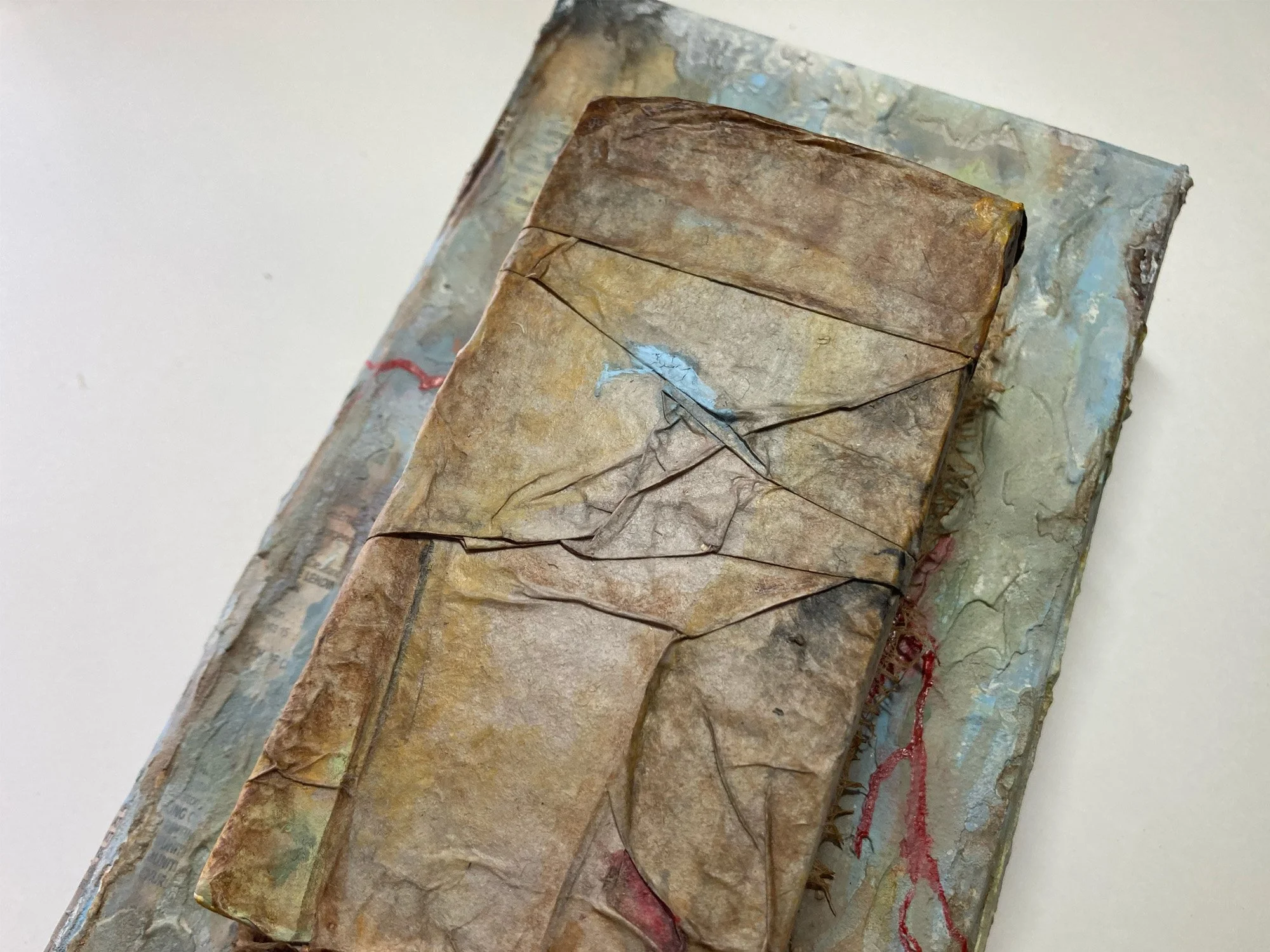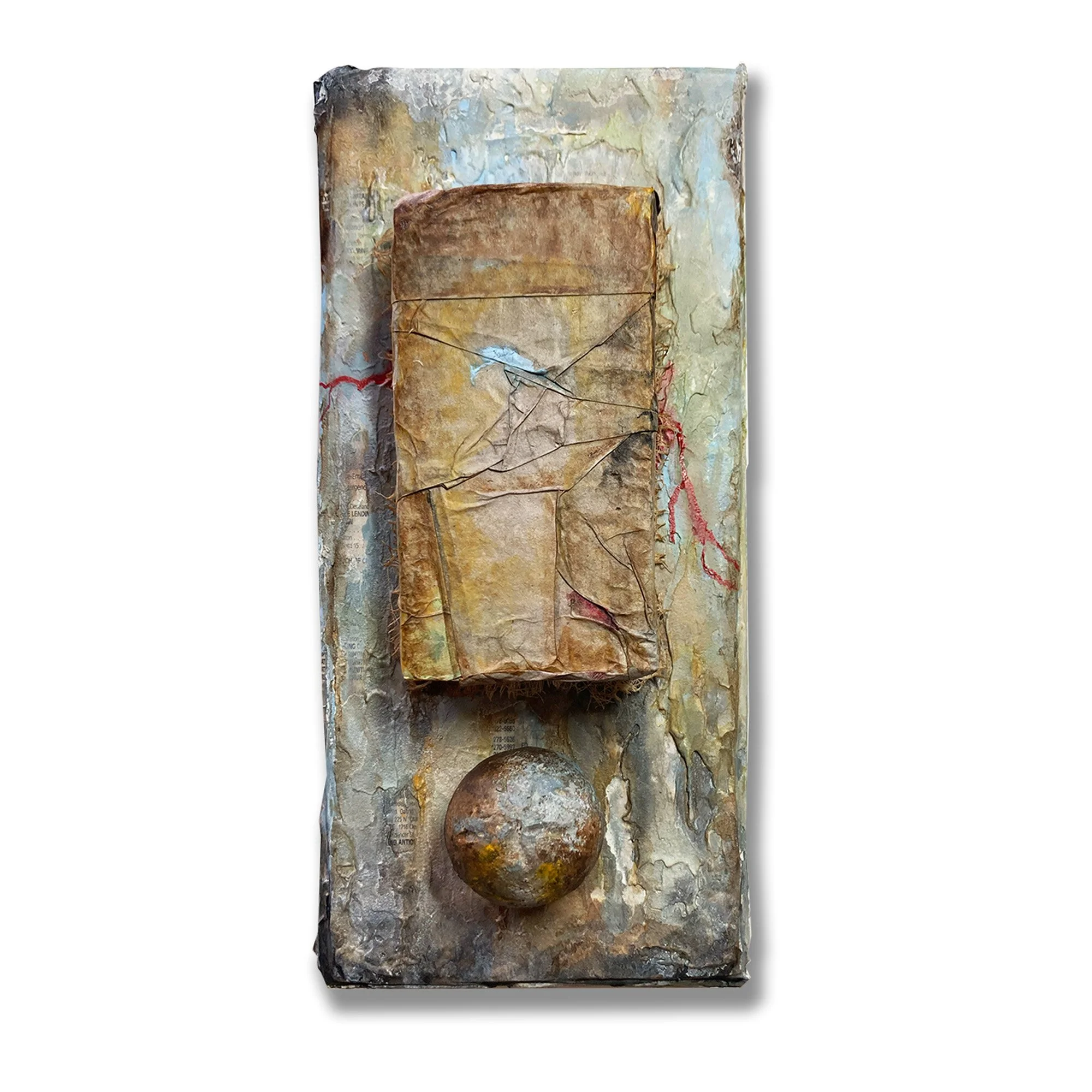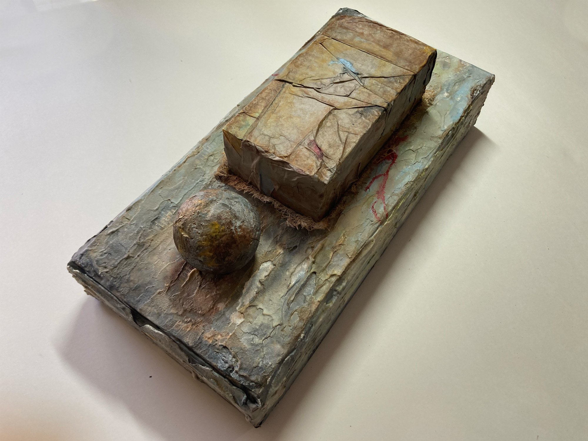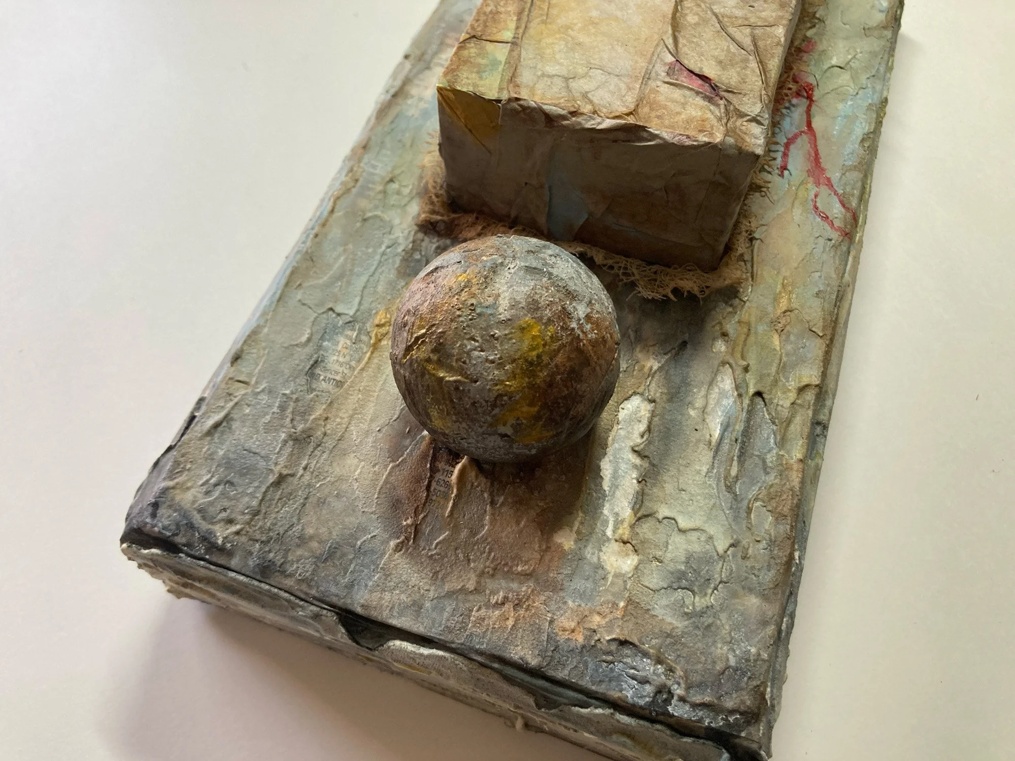 6” x 12” x 4” Corrugated Board, Wooden Sphere, Fabric, Textured Acrylic Paint $ 145