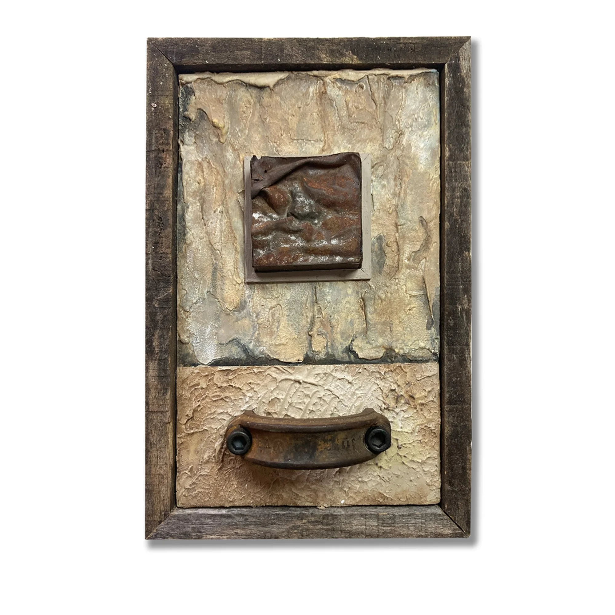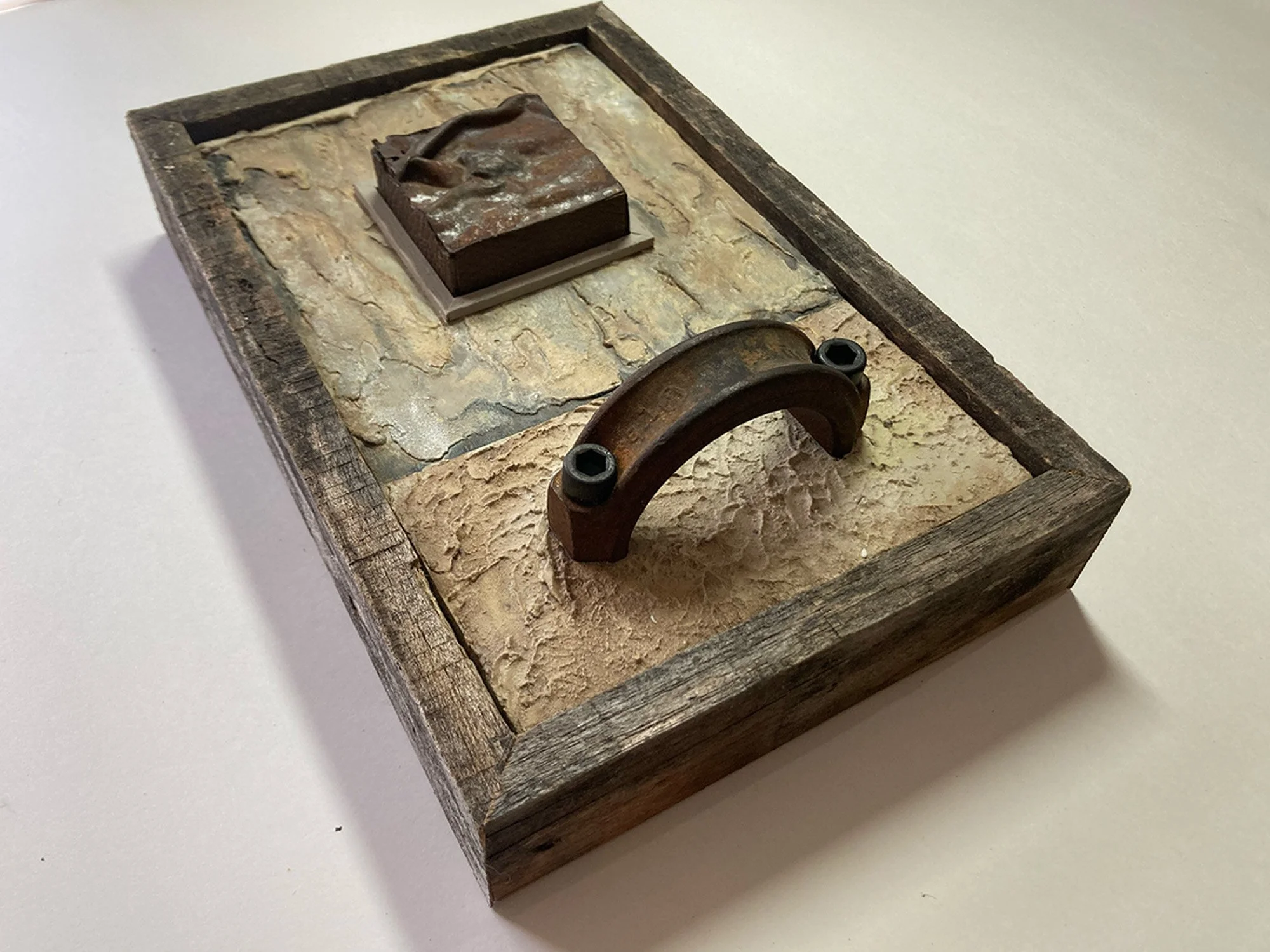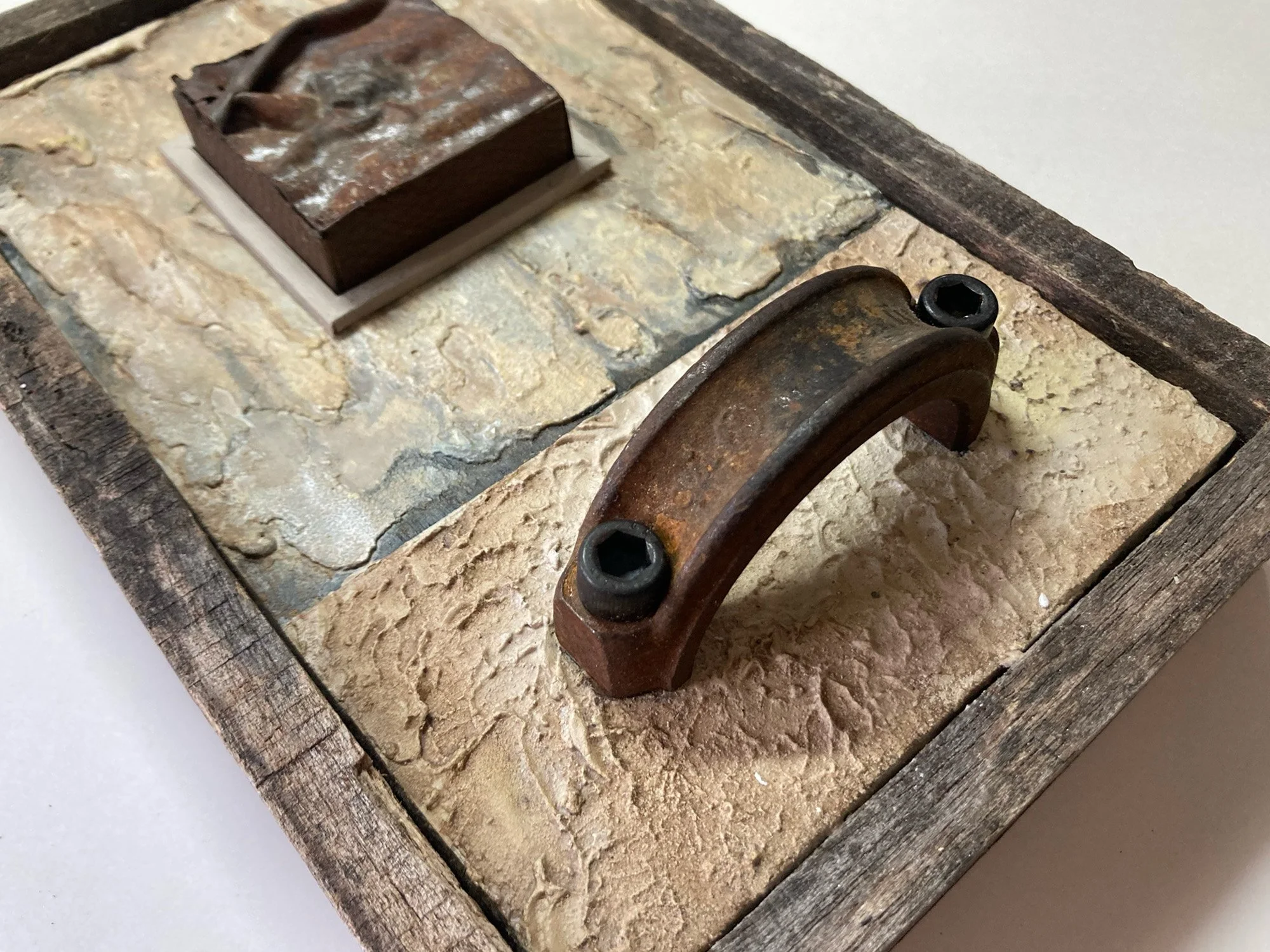 6.5” x 10” x 3” Wood, Steel, Leather, Fabric, Textured Acrylic Paint $ 155