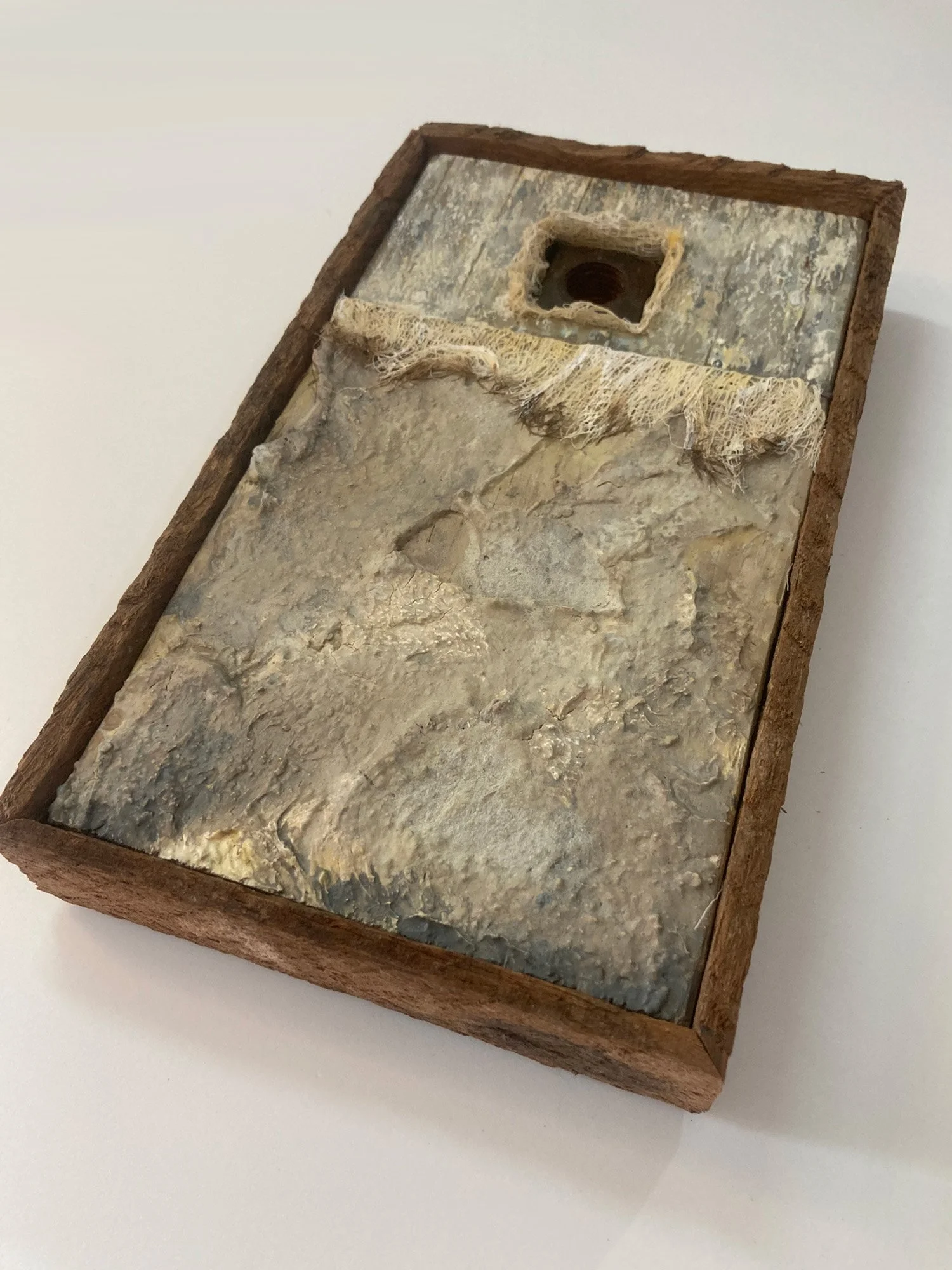 6.5” x 16” x 4” Wood, Rusty Steel Nut, Fabric, Textured Acrylic Paint $ 155