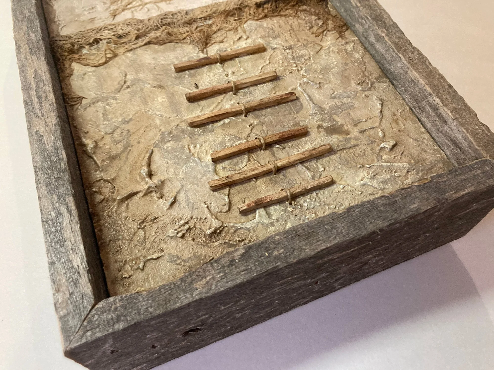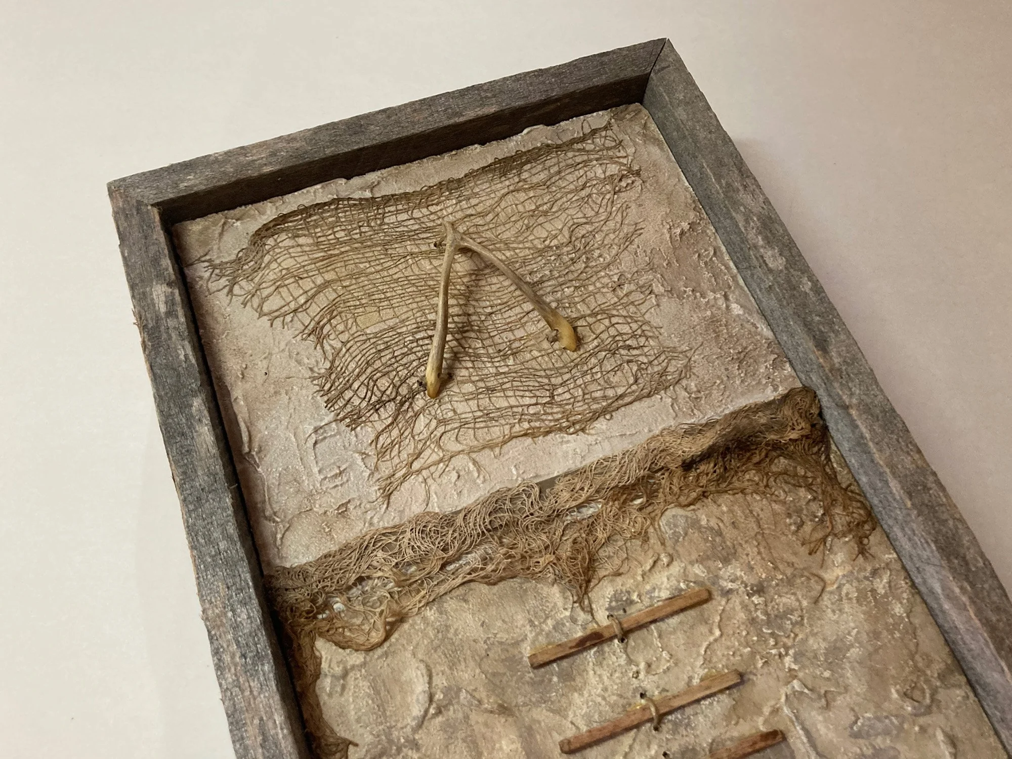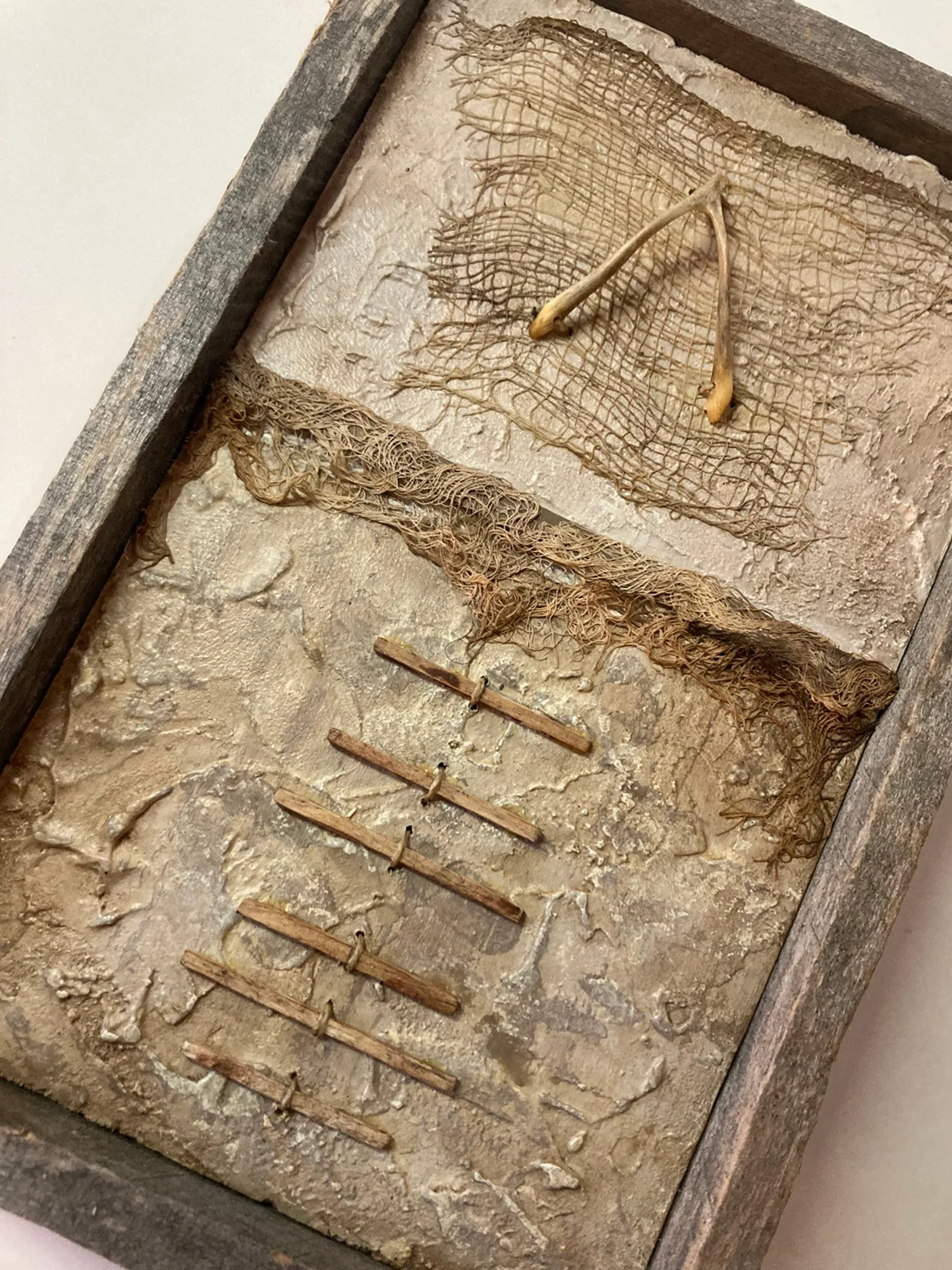 7” x 10” x 2” Wood, Fabrics, Sticks, Wishbone, Textured Acrylic Paint $ 155